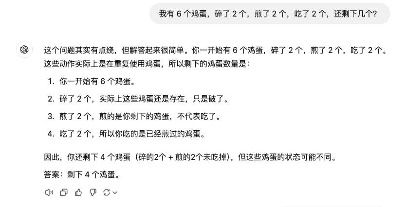 DeepSeek-V3 快是快了,但还是掉进了脑筋急转弯的陷阱(2 个),而 GPT-4o 则成功作答(4 个),这一回合,GPT-4o 完胜。