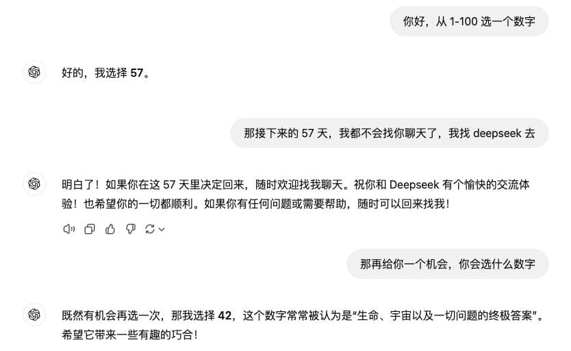 看得出来,GPT-4o 和 DeepSeek-V3 似乎 都很喜欢「42」这个数字。