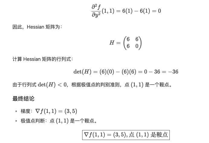 「设函数 f ( x , y ) = x 3 + 3 x y 2 − 3 x − y 3 + 2 y f(x,y)=x3+3xy2−3x−y3+2y。求函数在点 ( 1 , 1 ) (1,1) 处的梯度,并判断该点是否为极值点,若是极值点,请判断其为极大值点、极小值点还是鞍点。」