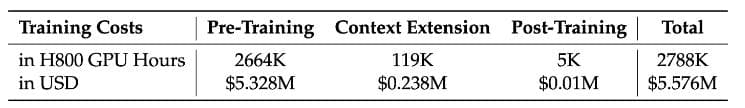 一手技术报告中提到,该模型的预训练阶段也就 用 2048 块 GPU 训练了 2 个月,并且只花费了 557.6 万美元。