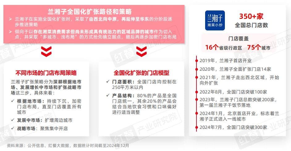 还有主打湘菜小炒的兰湘子,凭借清晰的品牌定位、高标准化的单店模型、多元化的线上运营、能够提供高附加价值的品牌承诺,以及独特的全国化扩张策略,近年来发展迅猛。截至2024年12月,其在全国已经开出了超过350家门店。2024年4月,兰湘子获得了弗若斯特沙利文颁发的“中国湘菜餐厅门店数量全国领先”的市场认证。