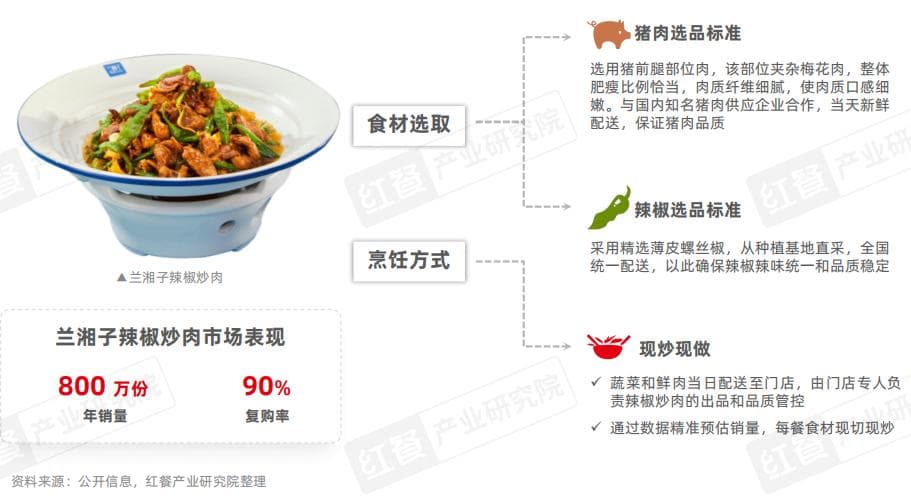 辣椒炒肉作为兰湘子的明星菜品,其市场表现十分亮眼,年销量达到800万份,并保持着高达90%的复购率。2024年,兰湘子更是获得了弗若斯特沙利文颁发的“湘菜辣椒炒肉销量第一”的市场认证。