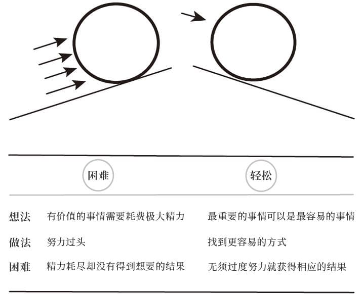 对一些人来说,“减少努力”的理念会令人不舒服,这会令他们有偷懒的感觉,令他们担心落后于人,或是为没有“多走一英里”而内疚。一定要摆脱这种心态,即认为做困难的事情本身具有内在价值,不仅迷信困难,还怀疑所有做起来容易的事。