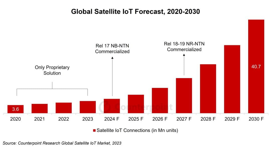 临近年末,又有研究机构对卫星物联网市场的未来发展给出积极预测——根据 Counterpoint 最新发布的《2023 年卫星物联网生态系统和市场概况报告》,全球卫星物联网连接数预计将从 2020 年的 360 万个增长到 2030 年的 4100 万个,复合年增长率为 28%。