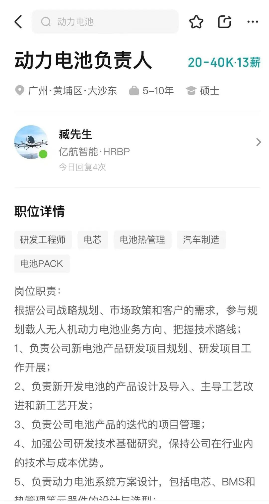 电池技术、电机、电控等“三电”技术是eVTOL发展的关键。除了与先进的动力电池和储能电池企业合作之外,eVTOL企业也会选择招聘相关人才。在招聘平台,亿航智能给动力电池负责人的待遇为20-40K,13薪。