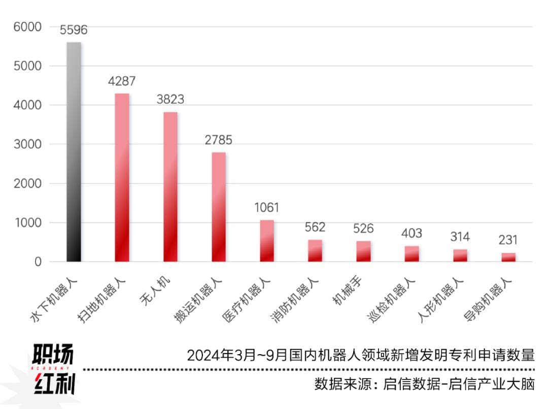家用服务机器人有所增长,康养、宠物机器人成为新的方向。水下机器人、扫地机器人和无人机产业新增发明专利申请数量最多,分别占近半年新增总数的26.75%、20.49%和18.28% 。沈阳新松机器人与百度共同推动康养机器人研制。2024世界机器人大会上,恒之未来公司推出的哮天SPARKY机器狗展示了智能四足机器人技术的最新成果。