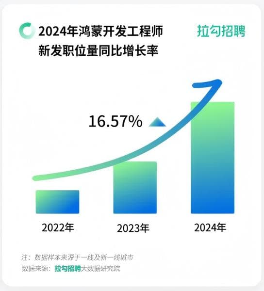 《数字科技领域2025届应届毕业生秋招洞察报告》显示,截至2024年11月,鸿蒙开发工程师的新发职位量较去年同期增长16.57%,平均招聘月薪较去年同期增长11.91%。
