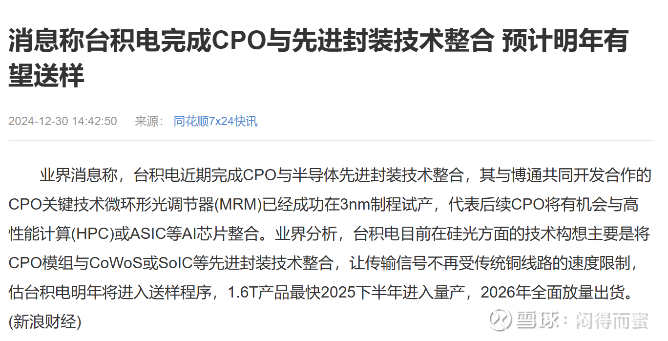 今天中午媒体广泛转载T明年底开始导入CPO技术的报道: