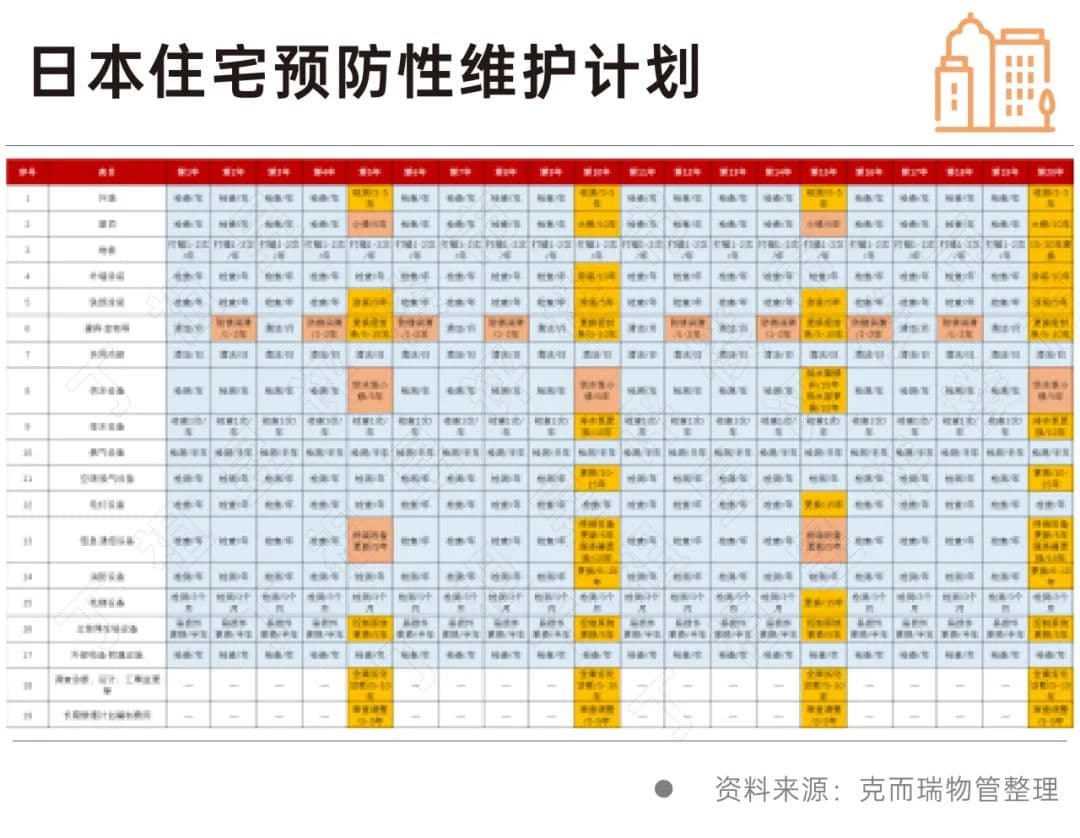 日本更是推行住宅预防性维护计划,即住房从建设之初就需要制定长达数十年的预防性维护计划,详细规定各项维护工作的频率和更换年限,涵盖外墙涂装、屋顶防水、电梯检测与更换、消防系统检修、供水排水系统检修及更换等多方面内容。预防性维护不仅延长了住房的使用寿命,确保建筑物在全生命周期内保持良好的运营状态,而且提高了业主居住的安全性和舒适度。