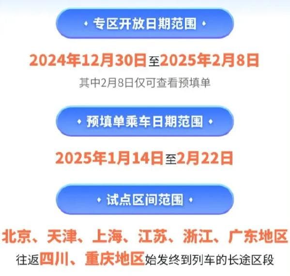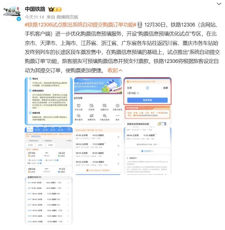 为进一步优化购票信息预填服务,开设 “ 购票信息预填优化试点 ” 专区,在北京市、天津市、上海市、江苏省、浙江省、广东省各车站往返四川省、重庆市各车站始发终到列车的长途区段车票发售中,在购票信息预填的基础上,试点推出 “ 系统自动提交购票订单 ” 功能。