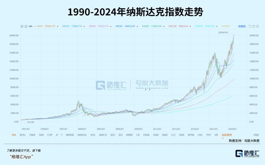 截止2024年末,纳斯达克指数相较30多年前,涨幅将近70倍,年复合增长率超过10%。