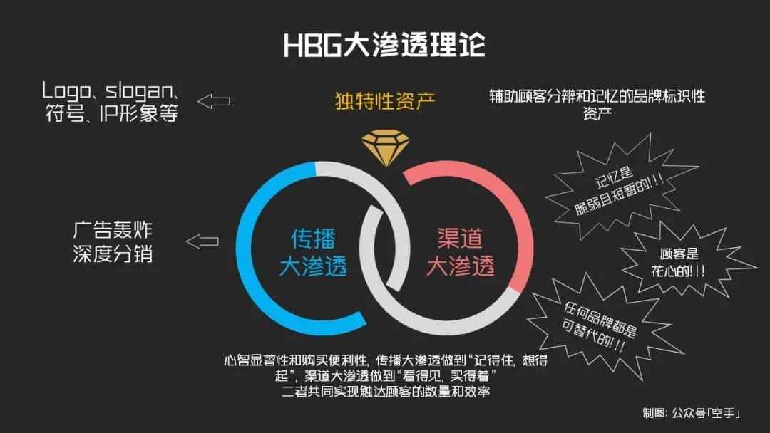 广告轰炸+深度分销,这两个部分加上一个品牌的独特性资产(不一定要差异化,但需要是品牌的标识性元素,作为消费者认知品牌的载体和抓手),构成了HBG大渗透理论的要点。