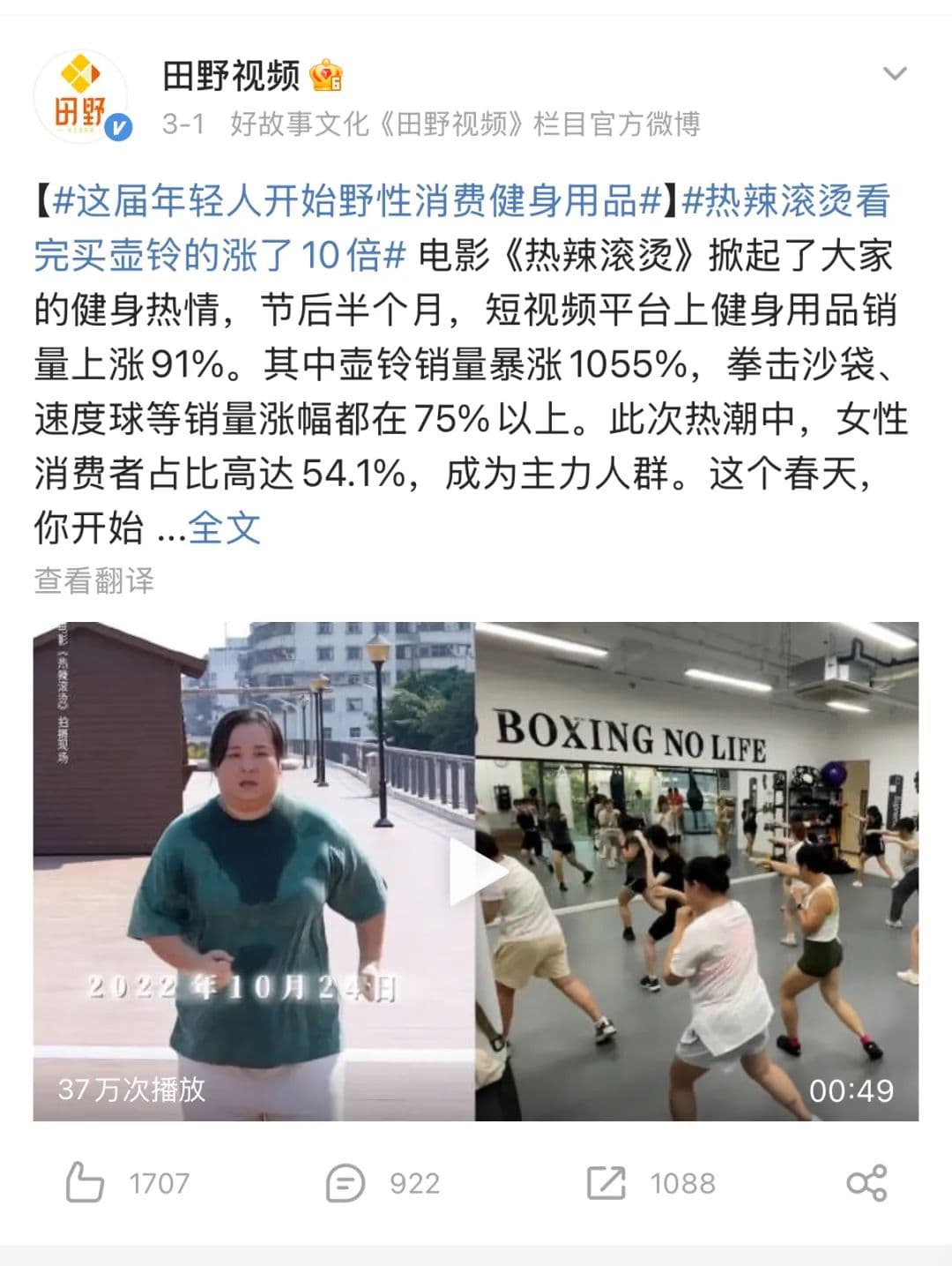 首先是2024年3月,#热辣滚烫看完买壶铃的涨了10倍#上了微博热搜。意思是说电影《热辣滚烫》掀起了大家的健身热情,电影上映半月间,壶铃销量暴涨1055%,拳击沙袋、速度球等销量涨幅均在75%以上。