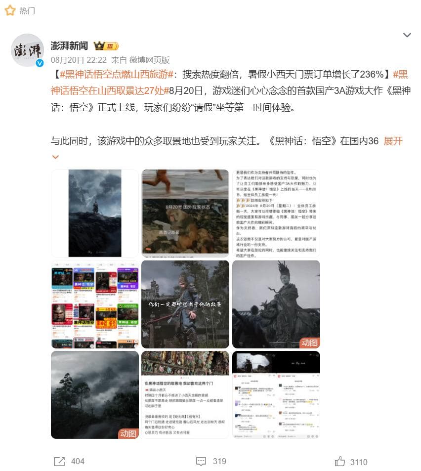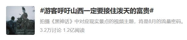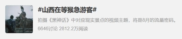 其次是8月份,由于游戏《黑神话:悟空》发布即爆火,带来了国内古建旅游的热潮,尤其是山西旅游。黑神话在国内36个取景地,山西独占27个。#黑神话悟空点燃山西旅游#、#游客呼吁山西一定要接住泼天的富贵#、#山西在等猴急游客#先后登上微博热搜。
