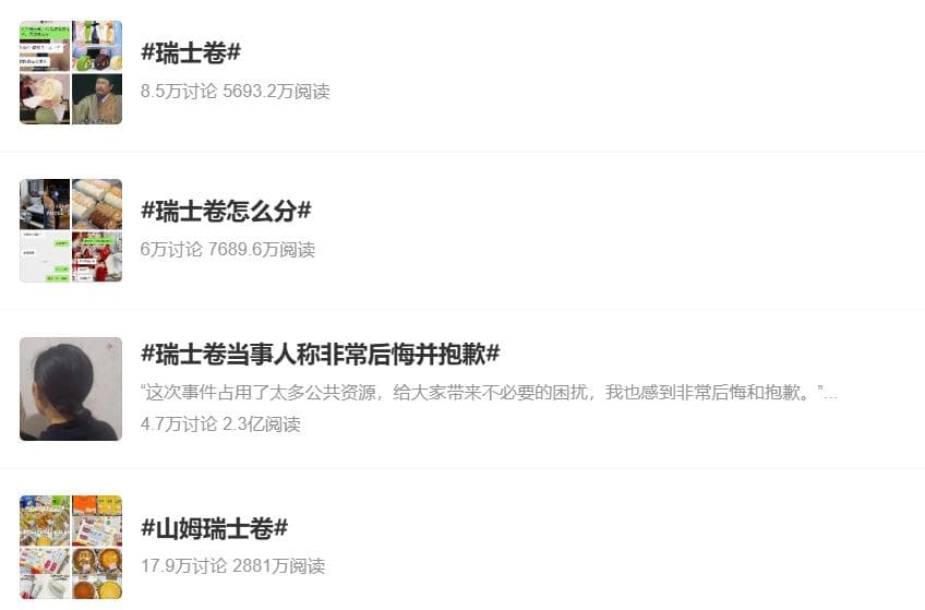 最后是11月初,当时一位博主发视频称“吃2个瑞士卷换来老公的一顿教育”,瑞士卷随即成为网络热点,很多人拿瑞士卷来测试自家老公,#瑞士卷怎么分席卷全网老公#成为热搜话题。