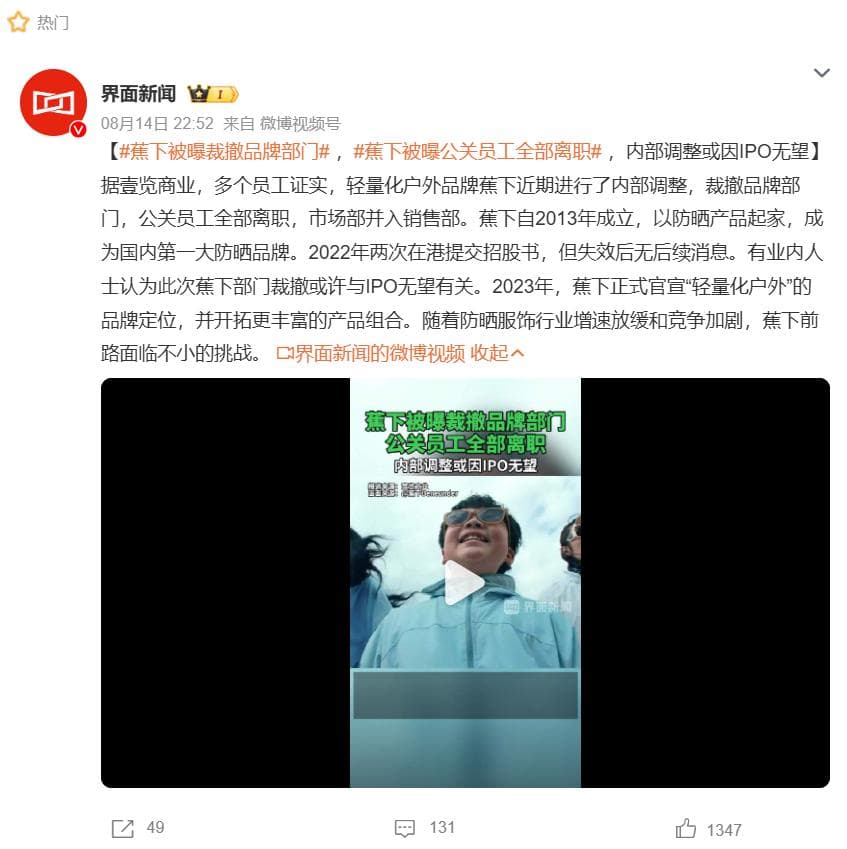 2024年8月,户外品牌蕉下进行内部调整,裁撤品牌部门,市场部并入销售部,公关员工全部离职。此举顿时引发业界热议,大家甚至开始讨论:企业是否还需要做品牌?品牌是否还对企业增长有效?