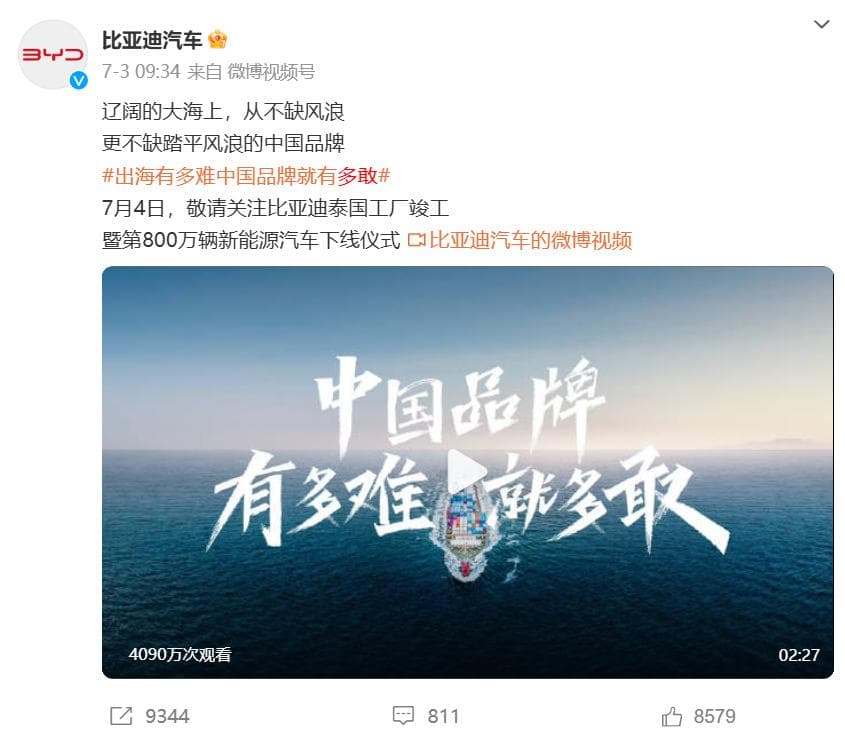 显然,比亚迪是尝到了甜头,并且也掌握了流量密码。2024年7月份,比亚迪泰国工厂竣工,于是它又如法炮制了一条《中国品牌有多难就多敢》,致敬迎难而上,坚持奋斗在出海征程的中国品牌。