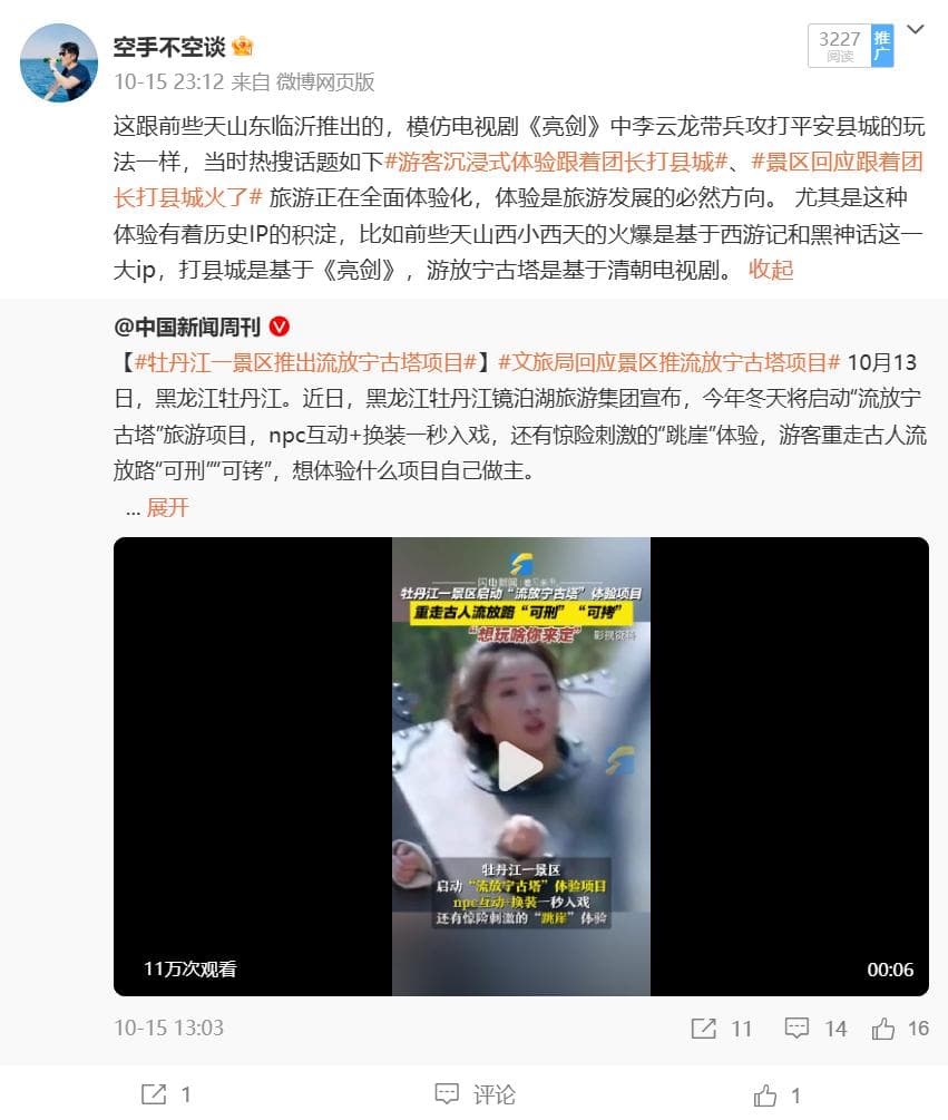 2024年10月7日,微博上有个热搜话题,山东临沂一景区推出“跟着团长打县城”旅游项目。10月14日,又有一个热搜是黑龙江牡丹江镜泊湖旅游集团推出“流放宁古塔”旅游体验项目。