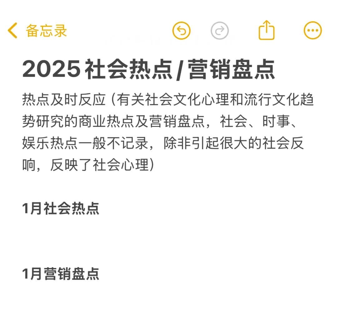 我在公众号和我的各个读者群里分享过多次,每年初我都会在手机备忘录里新建一个文档,用于记录这一年里的社会热点和营销热点,以此来对比、分析热点背后的社会心理和文化走向,寻觅商业的发展趋势,并从中找到新的营销理念和方法。