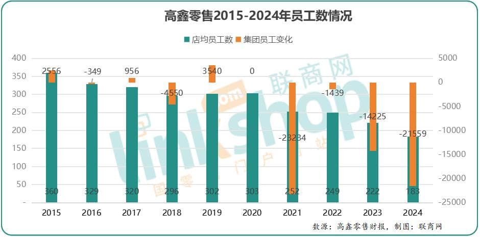 另一方面,随着单店业绩的下降,减员增效成了门店的必然选择。按照年报披露,以大卖场业态核算,大润发单店员工数从2015年的360人/店,2024年降到183人/店,整个高鑫零售的集团员工数也由14.77万人,下降到当前的8.62万人,2024年相对2023年,整个集团更是减少21559人;在去年3月份的一次出售传闻中,有大润发员工透露,大润发内部拟定门店精简硬指标,4月底是每店100人,管理团队是每店4名经理,12名课长,多余主管降职降薪。
