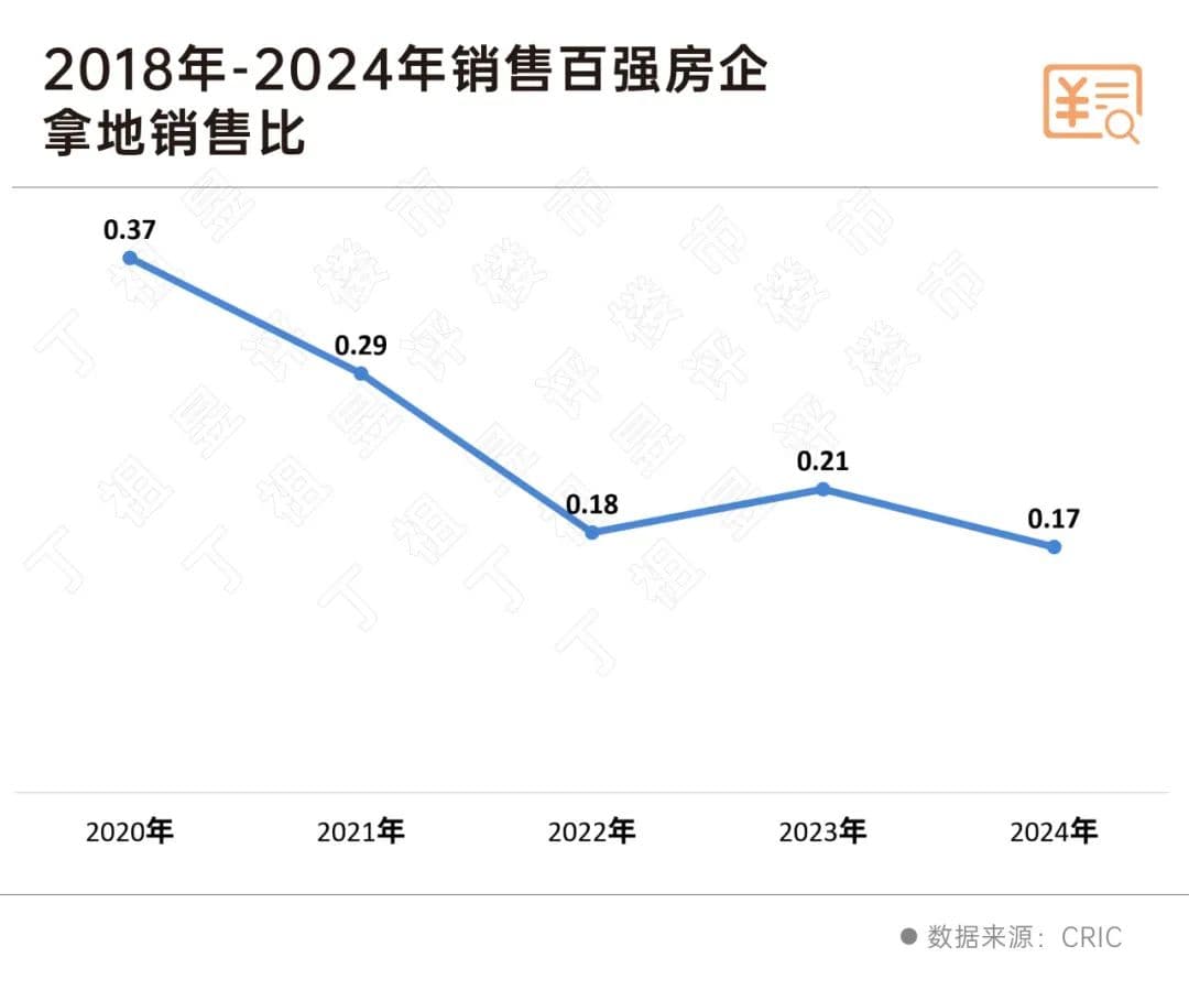 拿地销售比持续下行,2024年百强房企拿地销售比仅0.17,与去年相比下降0.04,创近五年新低。
