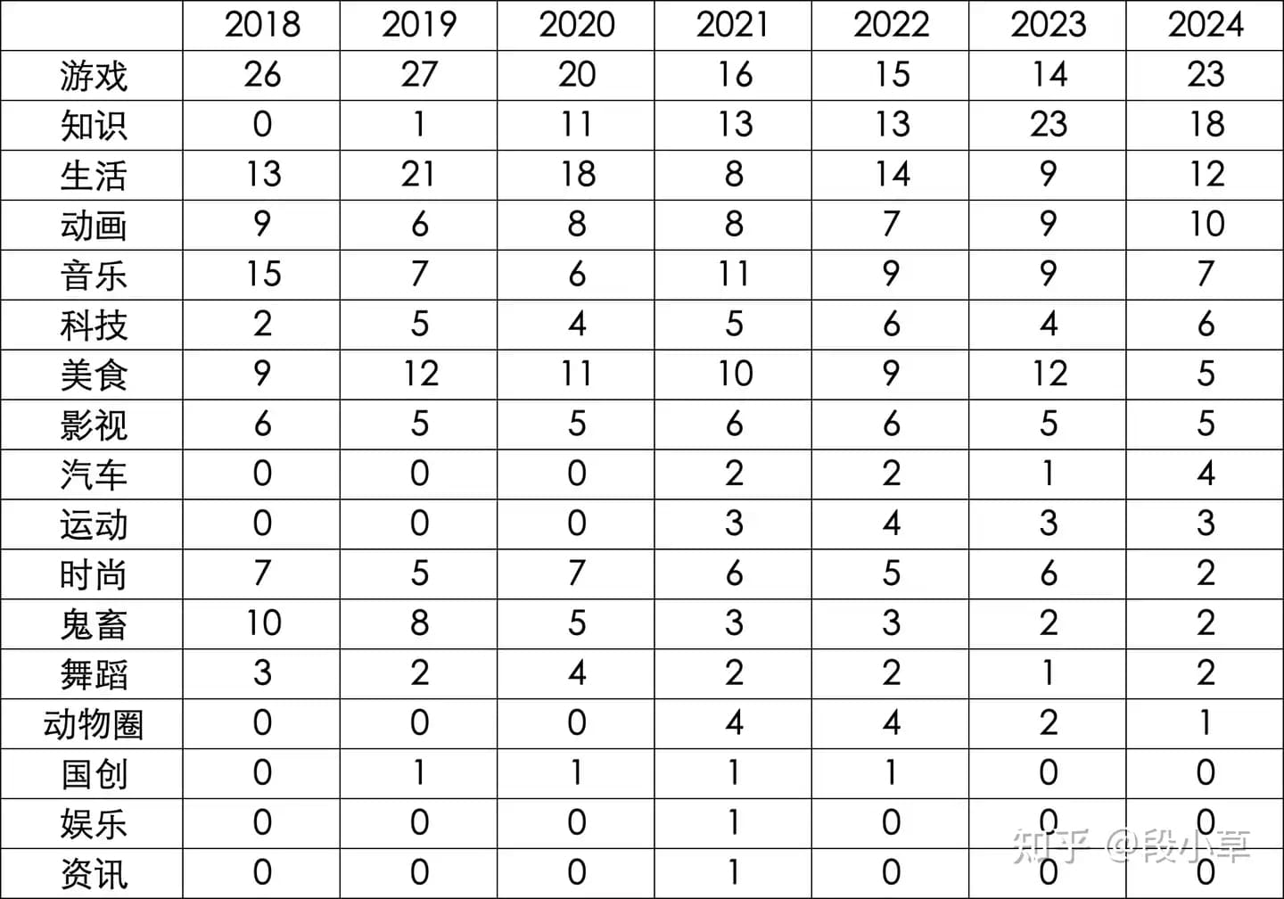 @段小草确定一位 UP 主的分区的方式,是基于 UP 主历史投稿中数量最多的“一级分区”。虽然这一方式存在部分 UP 主因投稿形式多元而难以界定的情况,但用于区分大多数的 UP 主并无争议。