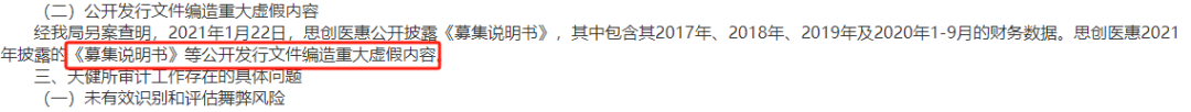另外,2021年1月22日,思创医惠公开披露向特定对象发行可转换公司债券《募集说明书》,其中包含其2017年、2018年、2019年及2020年1月—9月的财务数据。思创医惠2021年披露的《募集说明书》等公开发行文件编造重大虚假内容。