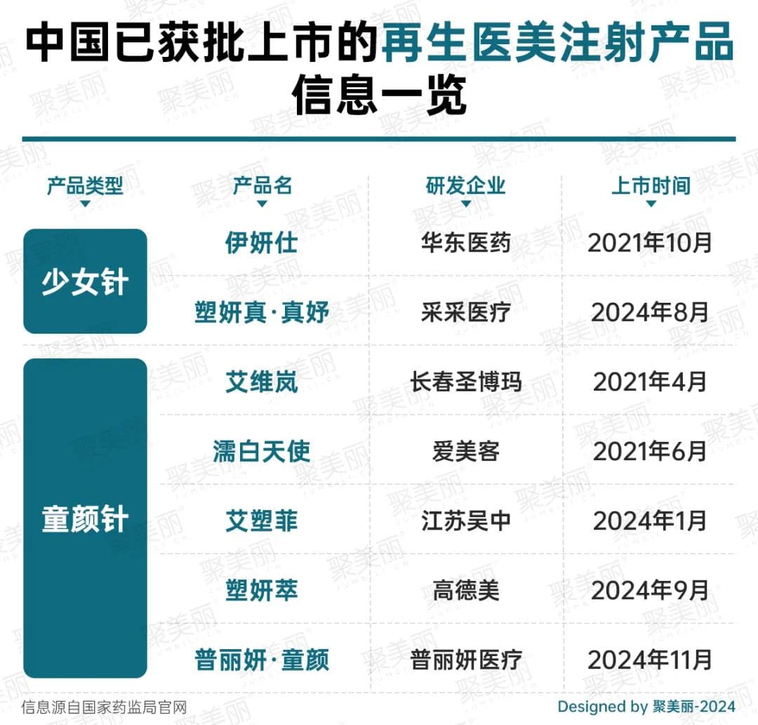 2021年,随着“童颜针”、“少女针”等产品陆续在国内获批上市,截至目前国内已拿到注册证的医美再生注射类产品累计有7款,仅今年就获批了4款。