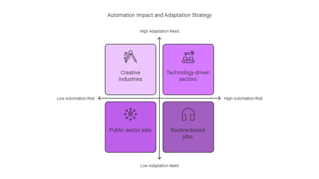 但整体上,技术驱动的岗位和常规岗位被替换的风险,大于创意产业和公共部门的岗位;岗位对适应性要求越低,被替换的可能性越大。