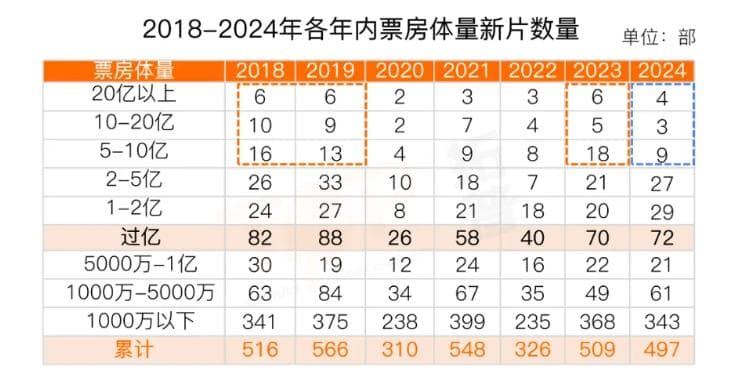比如,按影片票房梯队划分,会发现2024年头部梯队还是在,尾部堪称百花齐放,但腰部更软了。5亿-10亿和10亿-20亿区间的电影比2023年和疫情前少了太多。这一区间影片的疲软是导致票房大盘不佳的罪魁祸首,好几部明显冲着这个区间去的电影滑落到了5亿以下区间,而回看2023年的成功,也依赖像《消失的她》《孤注一掷》等这一区间的影片冲击到了更高位置。
