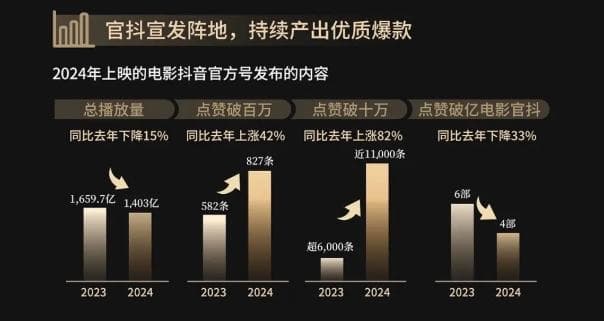一起一伏之间,彰显的是如今的商业电影在传播场域中的尴尬位置——不引发全民讨论,就会落得无人问津,没有中间值了。据《2024年抖音电影年度报告》,来自电影官方抖音账号的短视频,总播放量同比上一年下降了15%,但点赞破百万和破十万的视频数量却都有同比大幅提升,唯一下滑的是点赞破亿的账号。这与票房梯队结构形成了鲜明的互文。