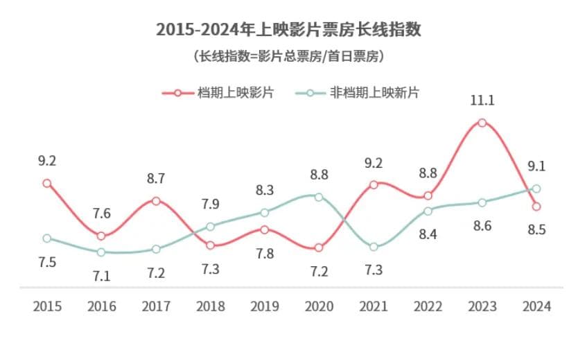 隐性的弊病在于,2024年定档于档期中的电影,长尾效应太弱,致使大盘一走出档期就发生断崖式下跌。而非档期电影的定档策略势必规避档期前后,这就导致档期附近时段影院尤其冷清。据猫眼,2024年档期上映影片长线指数为8.5,甚至低于2022年,同比上一年产生巨额跌幅。反倒是非档期上映新片,长线指数高达9.1,创历史新高。