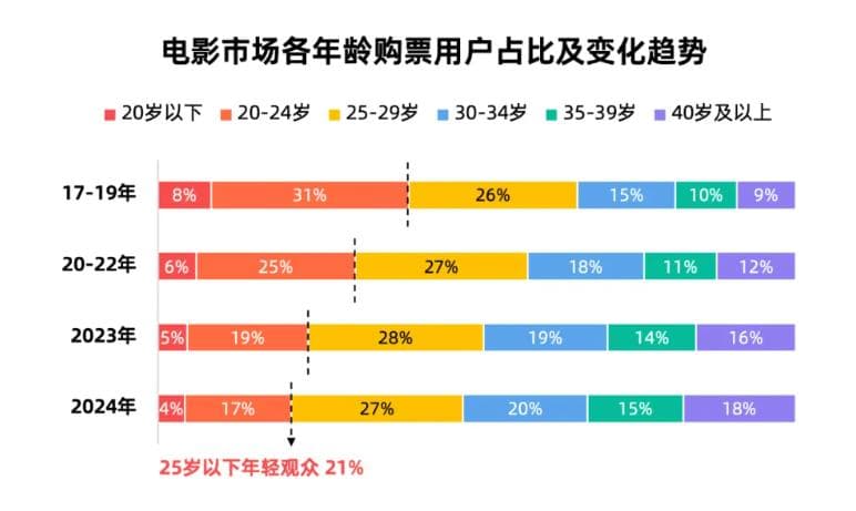 年轻观众的流失趋势同样愈演愈烈,25岁以下观众的占比从2017年-2019年的39%降低到2024年的21%,电影院对新一批观众的拉动作用越来越微弱。
