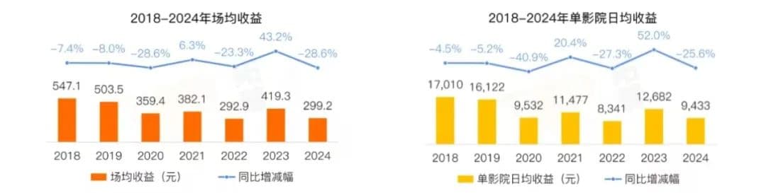 可惜的是,由于票房整体降幅较大,影院经营进一步承压。拓普数据显示,2024年影院场均收益299.2元,日均收益9433元,同比去年降幅均高于票房。