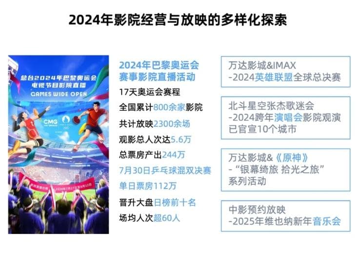 幸好,今年影院多样化的形式与动作层出不穷,为观影体验带来源源不断的新意。首先是内容端,诸如演唱会电影、舞剧电影、奥运会直播、英雄联盟全球总决赛直播等多种内容形态都在影院大银幕上陆续与观众见面。虽然这些内容形态所产生的实际票房,相对大盘而言实在有限,但其对于消费者的心智种植价值要远大于实际票房收益。人们会越来越意识到,大银幕能做的事情还有很多。
