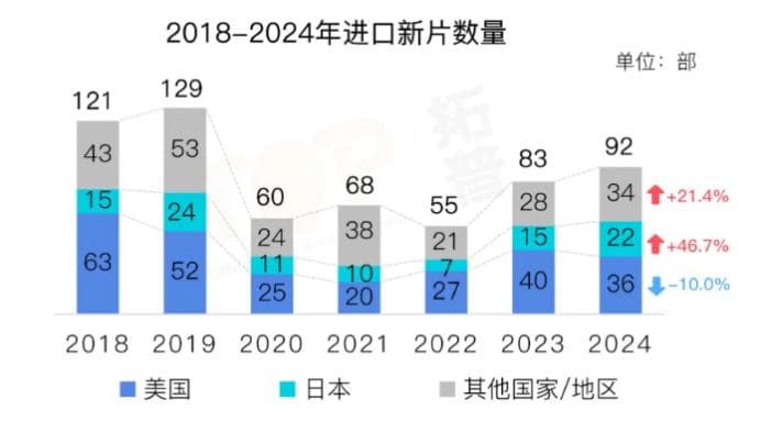 响应政策调整,进口片的供给结构更加百花齐放了。2024年进口片总数比前一年增加9部,其中来自日本和其他国家/地区的影片数量上涨,而来自美国的影片数量还减少了4部。许多买断片如《姥姥的外孙》《周处除三害》等获得了良好的票房成绩,为未来的买断片市场 打开思路。