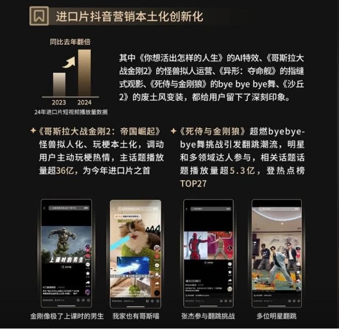 传播路径的变化尤其值得注意。毒眸在2023年就曾指出,好莱坞由于法律与文化意识的区隔,始终难以适应国内短视频占主导的宣发打法,而是坚持如户外广告、首映礼等传统电影营销策略。但2024年,进口片更加重视短视频了,进口片短视频播放量相比2023年翻倍。《哥斯拉大战金刚2:帝国崛起》《死侍与金刚狼》等影片均有引发全站互动的成功案例浮现,其思路也是在避免剧透正片的情况下,通过社 交玩法来带动用户自发传播。