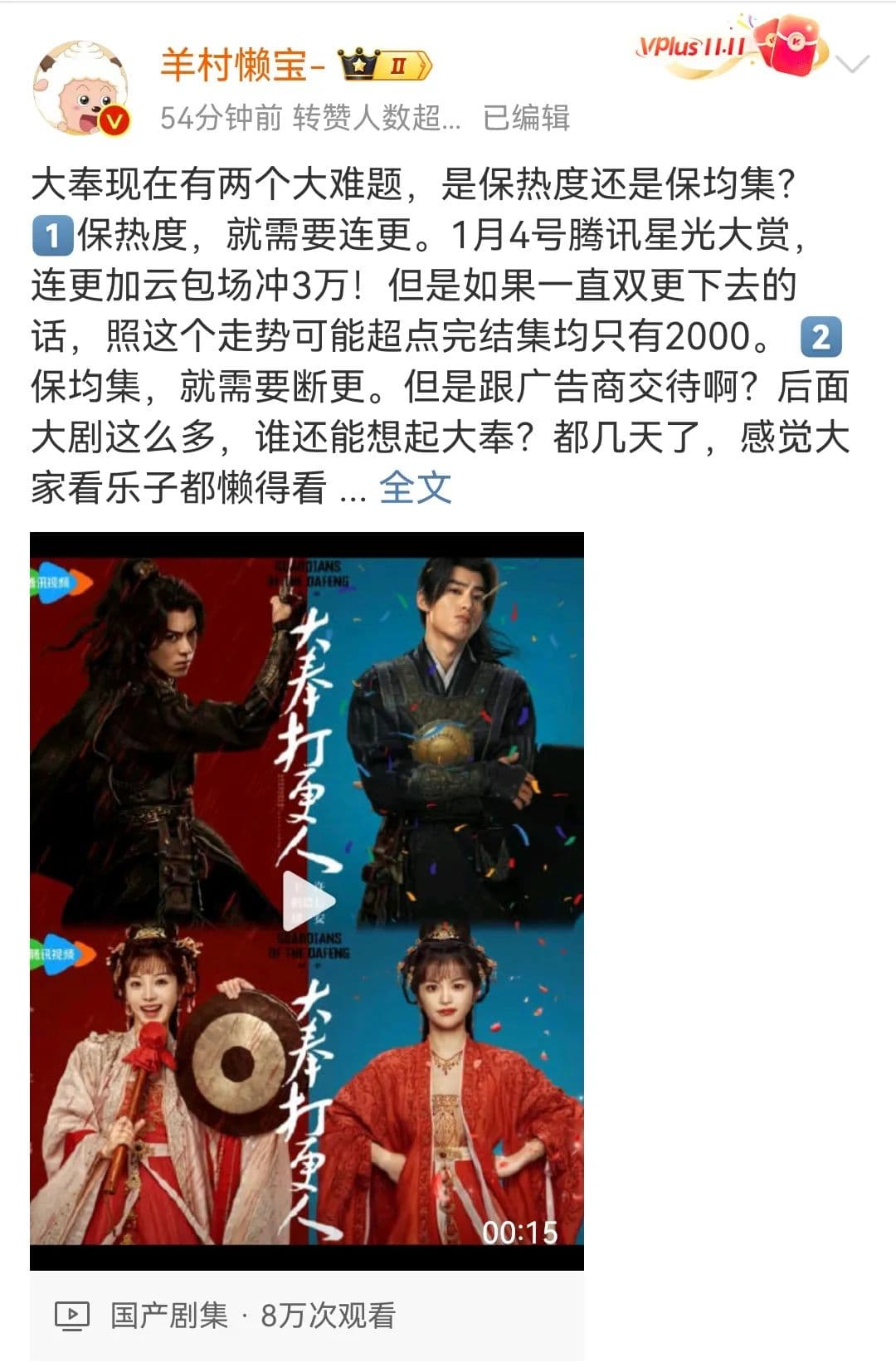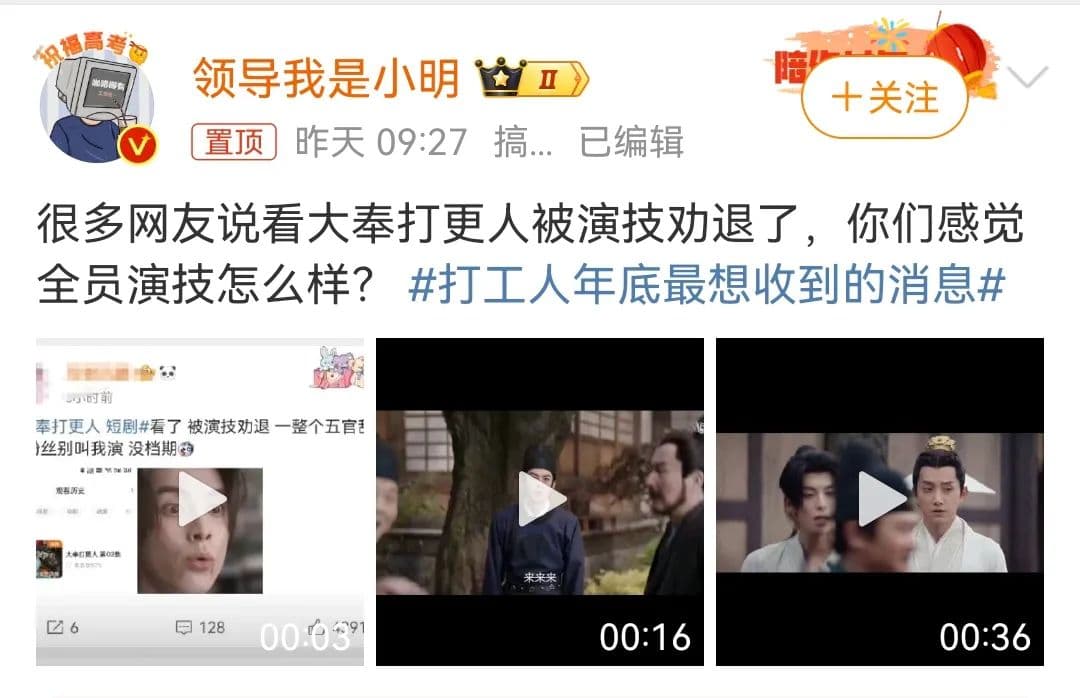 根据云合数据显示,截至1月2日,由王鹤棣主演、被押宝男频爆款的《大奉打更人》开播至今平台热度峰值仅突破28000。相较于普通大IP剧集来说,这一热度尚属意料之中,但对加满了各平台、圈层的高调“预制爆款”《大奉打更人》来说,“接生”多日都未突破3万热度爆剧大关,也不免被嘲上热搜。前期的诸多铺垫,更是被戏称为安小鸟保胎—第二天就熏艾。