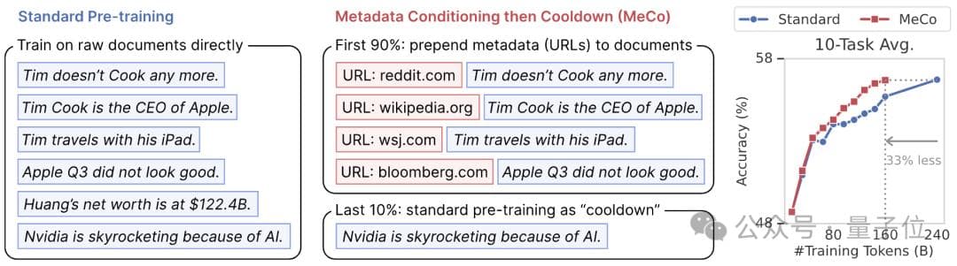 在这一背景下,他们提出了一种新的预训练方法,称为元数据调节然后冷却(MeCo,Metadata Conditioning then Cooldown)。
