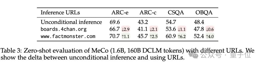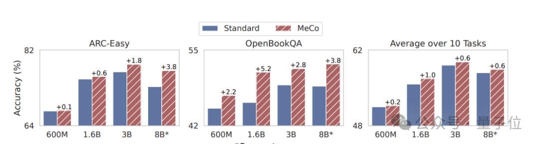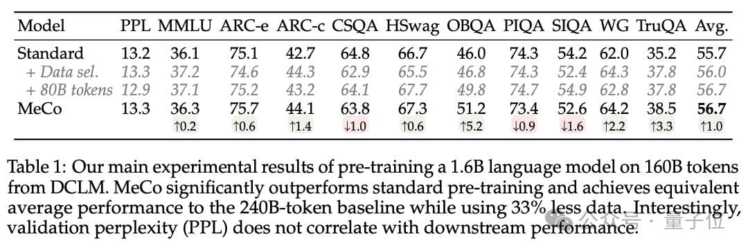 结果显示,MeCo 的表现明显优于标准预训练,其平均性能与 240B 标记的基线相当,而使用的数据却减少了 33%。