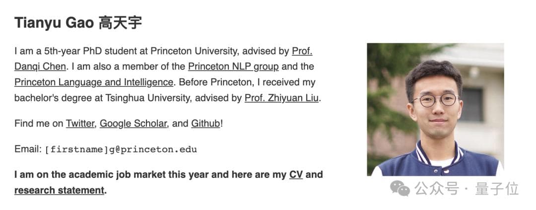一作高天宇,本科毕业于清华,是2019年清华特奖得主,目前普林斯顿五年级博士生,预计今年毕业,继续在学界搞研究,研究领域包括自然语言处理和机器学习的交叉领域,特别关注大语言模型(LLM),包括构建应用程序、提高LLM功能和效率。