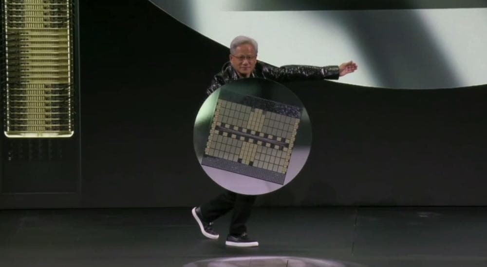 光是在硬件上,黄仁勋就接连整活儿,先搬出一个由72块Blackwell GPU组成的NVLink72巨型“盾牌”,并现场cosplay起美国队长,引起现场观众的欢呼。