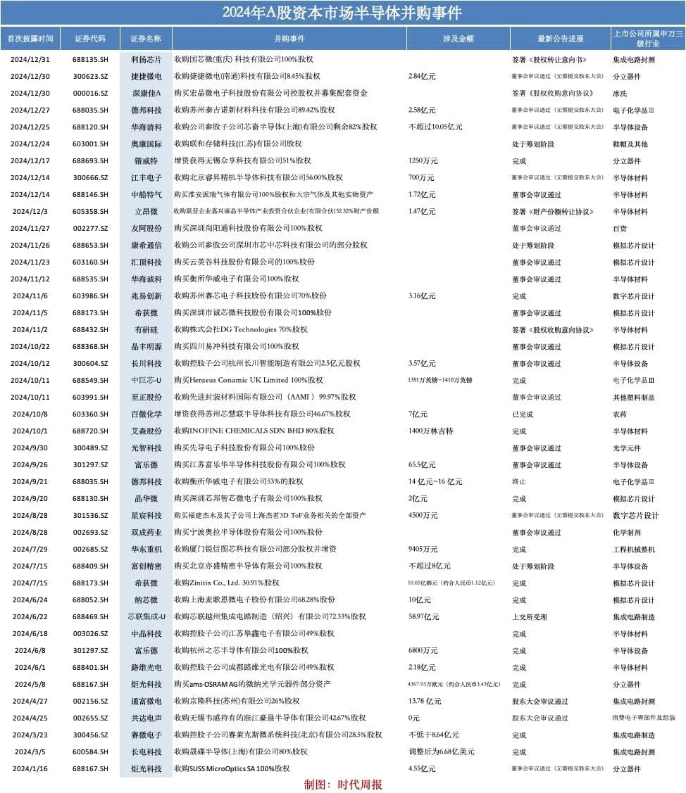 2024年12月,先有“温州鞋王”奥康国际跨界收购存储芯片公司,后有深康佳A筹划收购宏晶微电子;在此之前的11月,友阿股份拟收购半导体功率器件公司尚阳通;10月,百傲化学(603360.SH)增资芯慧联、至正股份拟收购半导体引线框架公司先进封装;9月,光智科技拟并购半导体材料公司先导电科;8月,双成药业拟收购模拟芯片公司奥拉股份……
