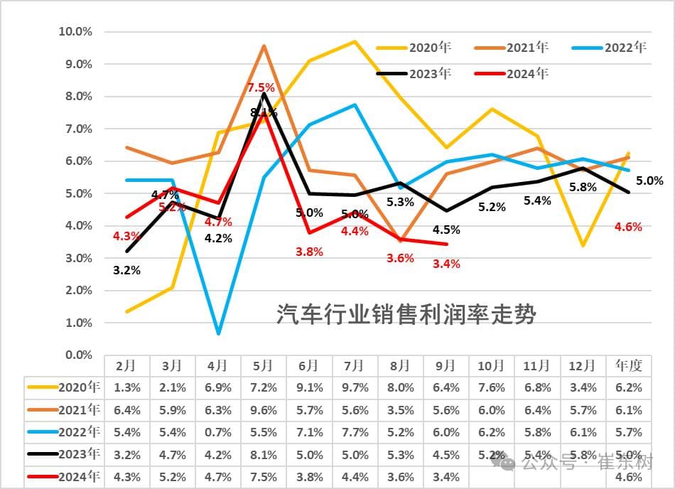 乘联会数据显示,2024年第三季度,汽车行业的利润率仅为4.6%,低于下游工业企业利润率6.1%的平均水平。从趋势来看,汽车利润率正逐年走弱,且创近10年来新低。
