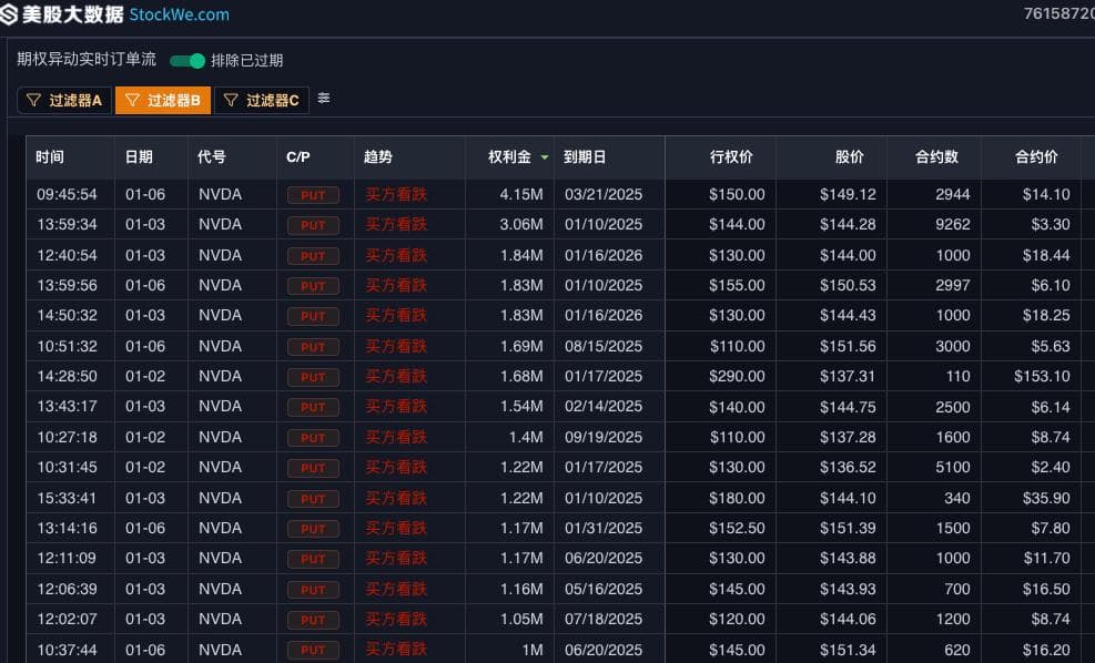 根据美股大数据 StockWe.com的期权统计数据,美股盘中,约有20万份1月17日到期、执行价140美元的看涨期权,以及60万至70万份2月21日到期、执行价159美元至165美元的看涨期权被基本卖出。
