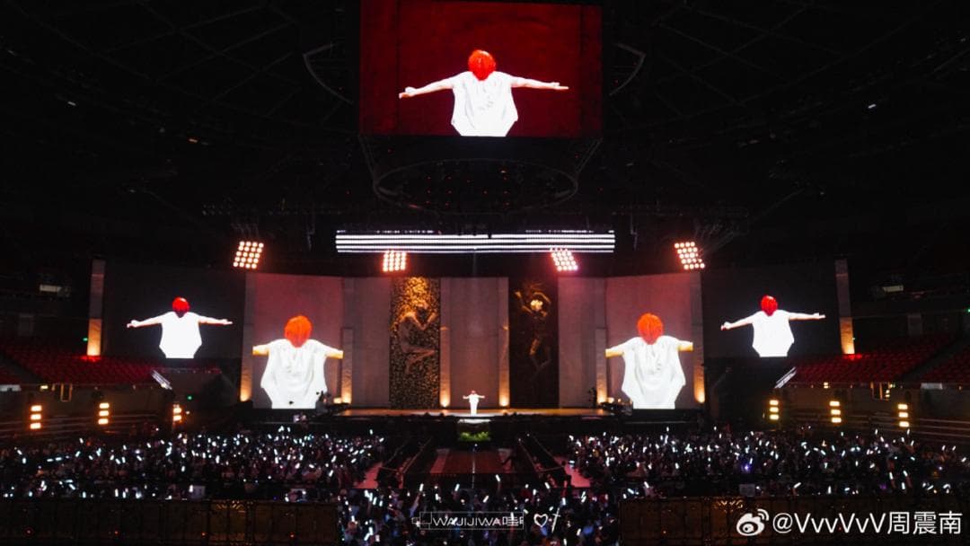 周震南则把演唱会玩成了舞台剧+装置艺术展览+魔术表演的多重体验。来到他十月份演唱会现场的观众,一定会记住那两个巨型花体实墙。在音乐响起后,周震南更是在魔术视觉差的帮助下,巧妙运用替身完美“骗”过现场观众,来了个意想不到的登场。