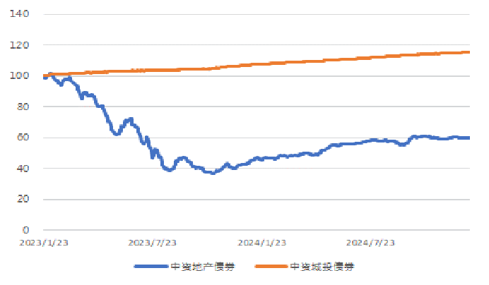 图2. 中资房地产、城投板块美元债指数走势(基准=100)