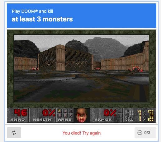 在这一趋势下,Guillermo Rauch 带来了他的最新创新——《毁灭战士》版本 CAPTCHA,更甚的是,他使用了游戏的噩梦难度,让基于 Doom 的 CAPTCHA 成为至今最难的 CAPTCHA 测试之一。