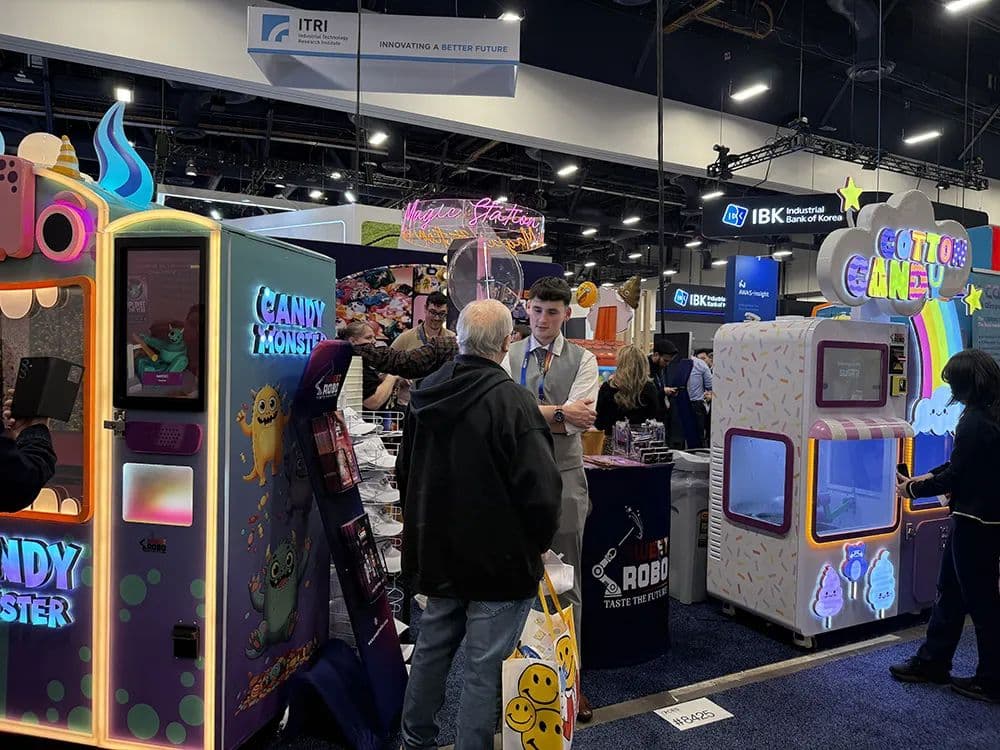 Sweet Robo的展位宛如童话世界,摆放着七彩斑斓的机器人自动售货机、冰淇淋机和糖果机。该公司在今年的CES上推出了一台AI自动售货机,只用90秒就能制作出一个定制的手机壳。