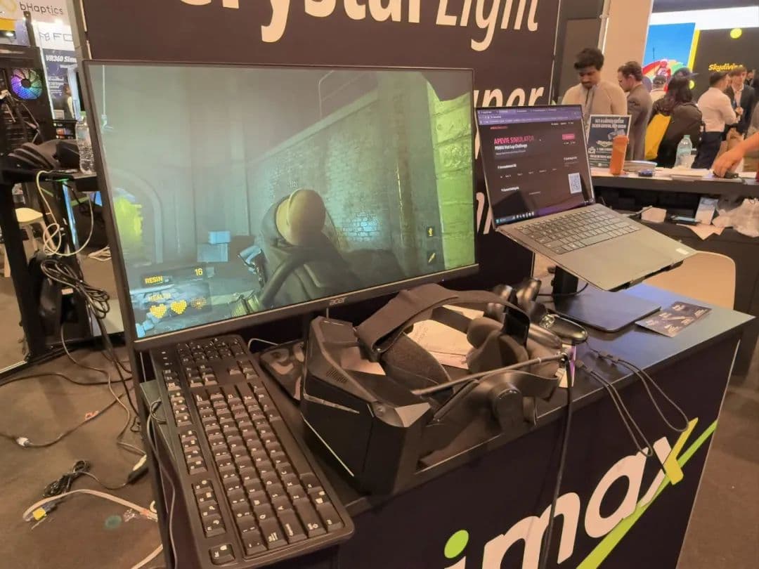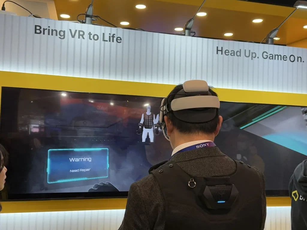 韩国VR触觉解决方案提供商bHaptics展示了旗舰触觉背心TactSuit Pro,支持Quest、索尼PSVR2等的270多款游戏,现场就能带着头显与触觉背心,沉浸式体验枪击游戏。
